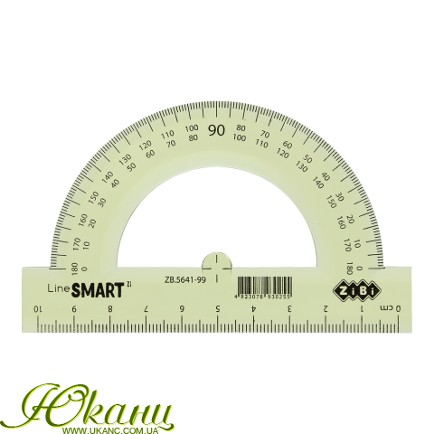 - 1 транспортир з двома шкалами для побудови та вимірювання гострих та тупих кутів від 0° до 180° (з поділками в 1°)