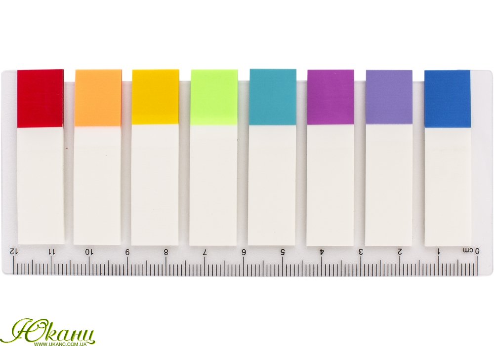 Стікери пластикові 45х12 мм, асорті, 120 аркушів. Складаються з білої матової частини - малопомітною на папері (не закриває текст під закладкою), і яскравого кольорового корінця. Хороший клейкий шар - листок можна неодноразово використовувати. Не залишає слідів клею на поверхні. Закладки ідеально підходять для виділення інформації. На закладці можна робити позначки. Асорті з 8 кольорів дає можливість виділяти окремим кольором частина документа або окремі сторінки, що дозволяє зручніше працювати з інформацією. Особливо незамінні при роботі з оригіналами документів в яких не можна робити позначки текстових маркерів або ручкою. Закладки поставляються на прозорому пластиковому диспенсері. Це дозволяє зручно зберігати і використовувати весь блок не втрачаючи окремі кольори.