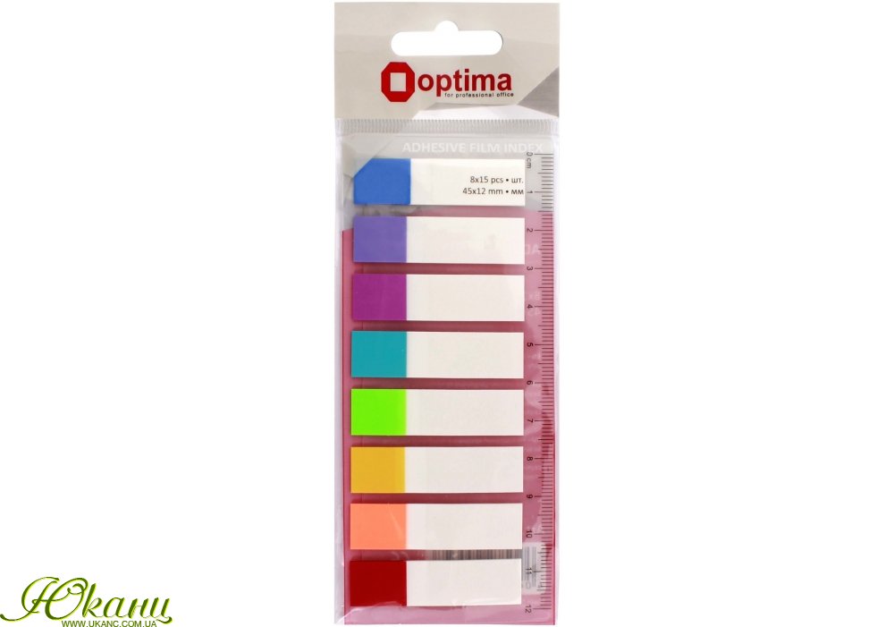 Закладки пластикові з клейким шаром Optima, 45х12, 8 кольорів, 120 шт.