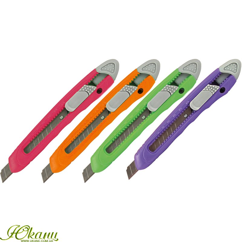 Канцелярський ніж зі сталевим багатосекційним лезом. Ергономічний корпус із міцного пластику, механізм східчастої подачі леза. Фіксатор леза.