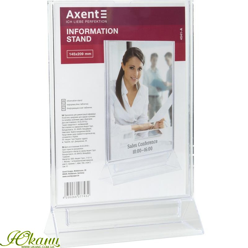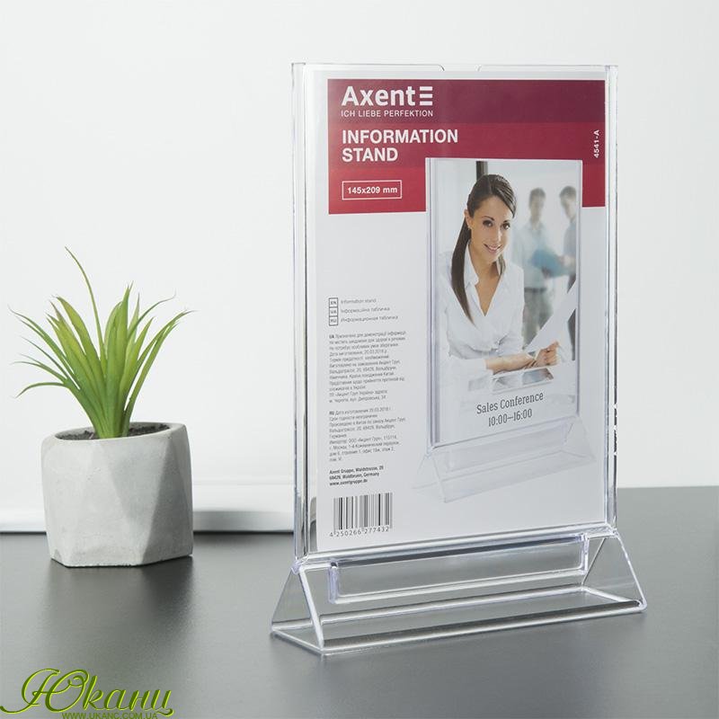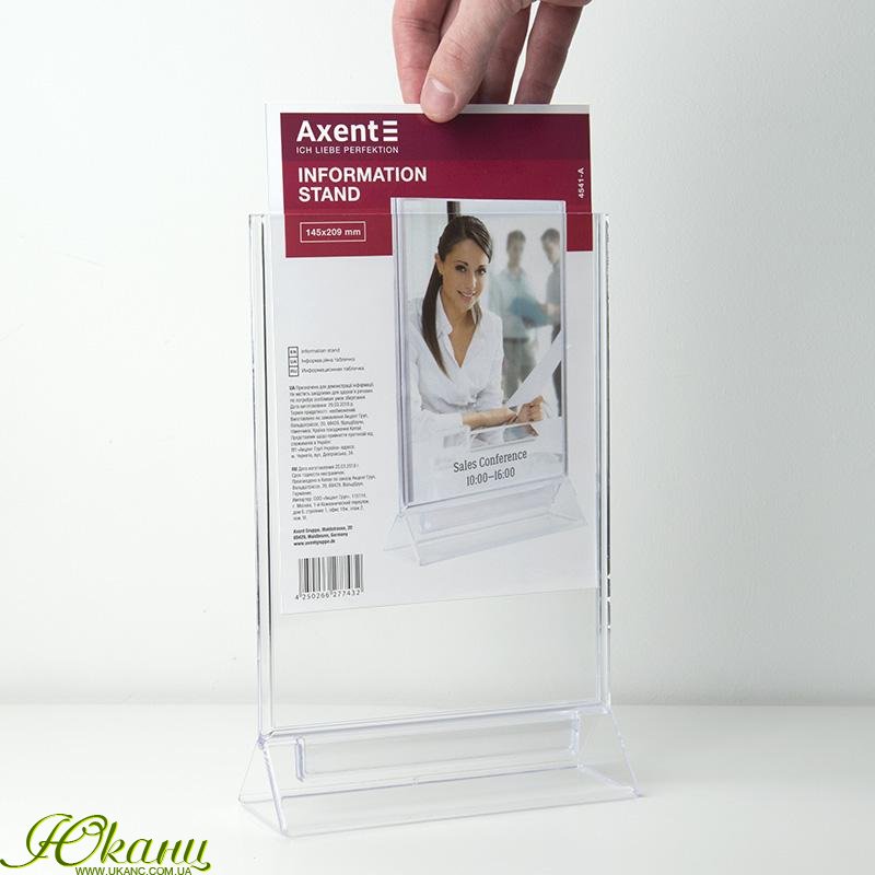 Двосторонні інформаційні таблички широко використовуються для розміщення реклами та іншої інформації при роботі з клієнтами - в банках, ресторанах (наприклад, спеціальні меню), на рецепції готелів, в салонах краси і т.д. Табличка інформаційна двостороння Axent виготовлена з кришталево прозорого пластику (полістиролу), який не порушує передачу кольору і чіткість зображень. Зручна виїмка для пальців дозволяє легко замінити вкладиш в табличці.