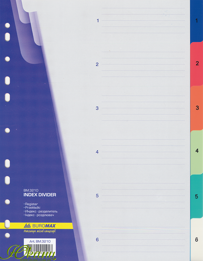 Цифровой индекс-разделитель для регистраторов А4 BUROMAX – удобный и простой в использовании аксессуар для папок-регистраторов. Он служат для систематизации, быстрого и удобного поиска документов в подшивке. Титульная страница разделителя – удобный лист для описи вложенных документов. Разделители цветные с разбивкой по цифрах от 1 до 6. А уникальная перфорация подходит для всех папок-регистраторов или папок с кольцевым механизмом.