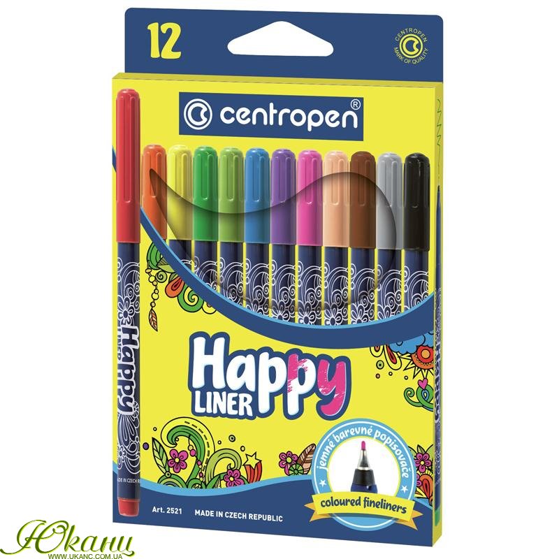 Набір лінерів 2521 HAPPY, 12 кольорів, для креслення, малювання, круглий корпус з ергономічною зоною захоплення, пластиковий круглий пишучий вузол в металевій оправі, ширина лінії 0,3 мм, картонна упаковка. Вироблено в Чехії.