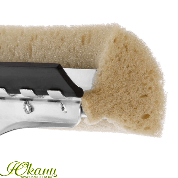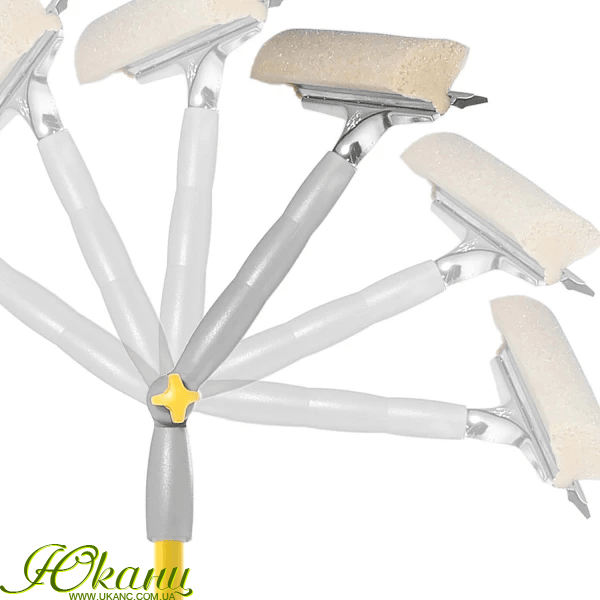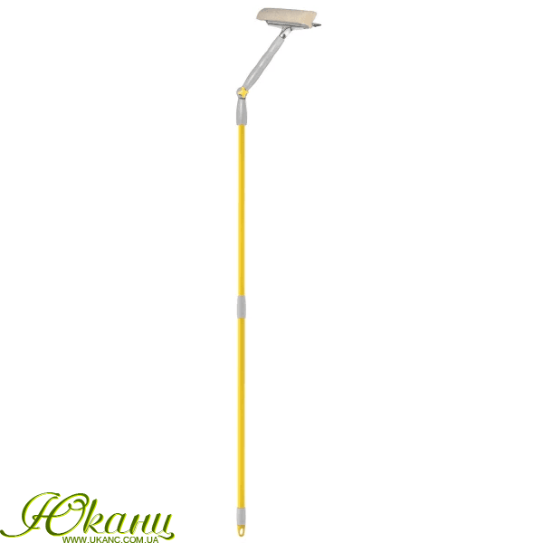 Система миття вікон із губкою, гумовою поворотною основою та телескопічною рукояткою. Рукоятка з ергономічною рукояткою та міцною металевою конструкцією, яку можна використовувати окремо. Завдяки шарніру може мити важкодоступні вікна, навіть горизонтальні. Не залишає смуги на склі.