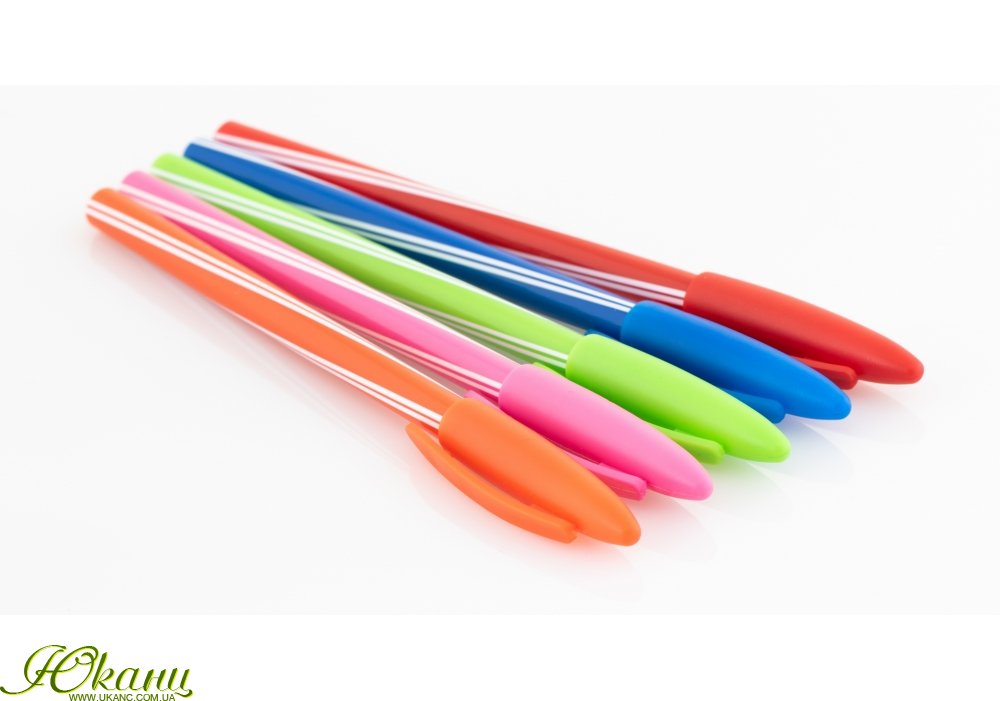 Масляна ручка. Пластиковий прозорий корпус. Колір ковпачка відповідає кольору чорнила. Діаметр кульки 0,7мм.