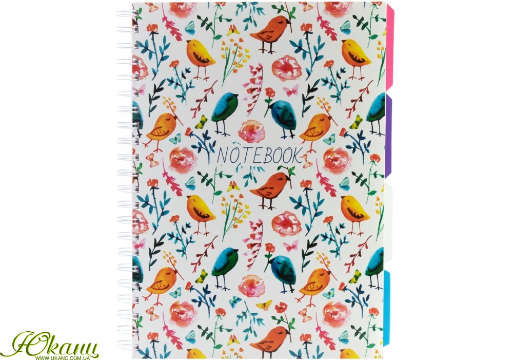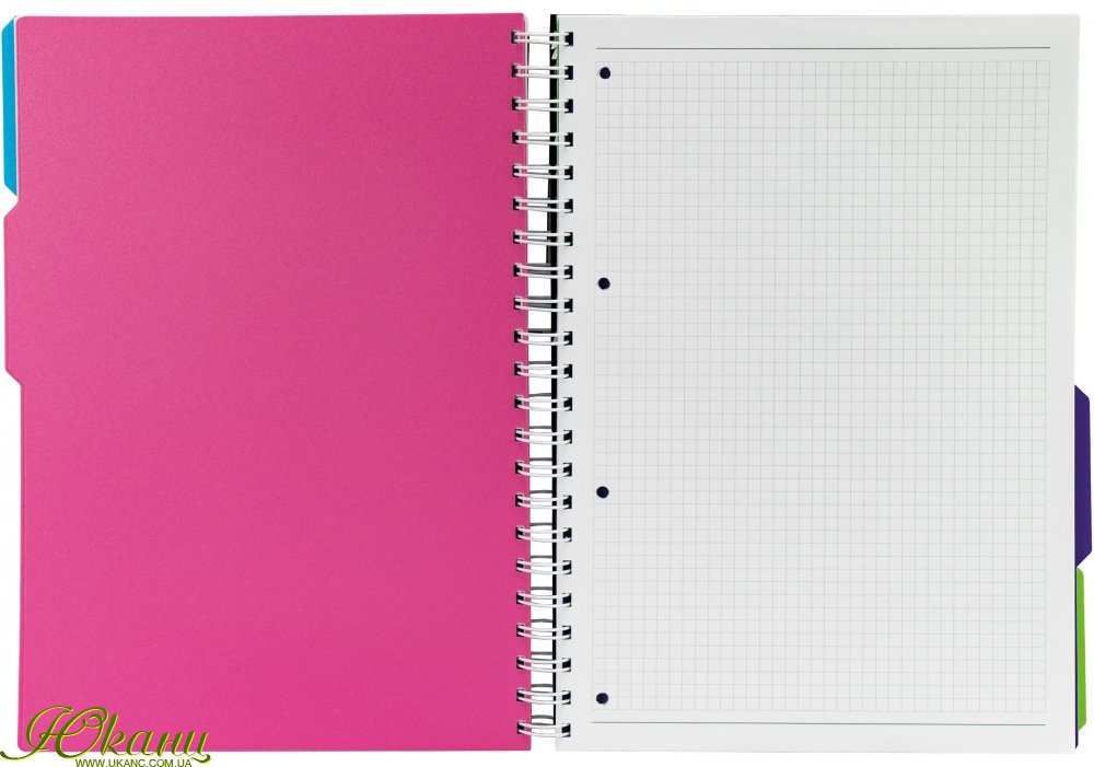 Блокнот формату A4 (200x285). Кріплення блоку - спіраль. Обкладинка - пластик. Внутрішній блок - коледж-блок з перфорацією, клітинка, щільність паперу - 70 г/м2, кількість аркушів - 120. З розділювачами блоку.